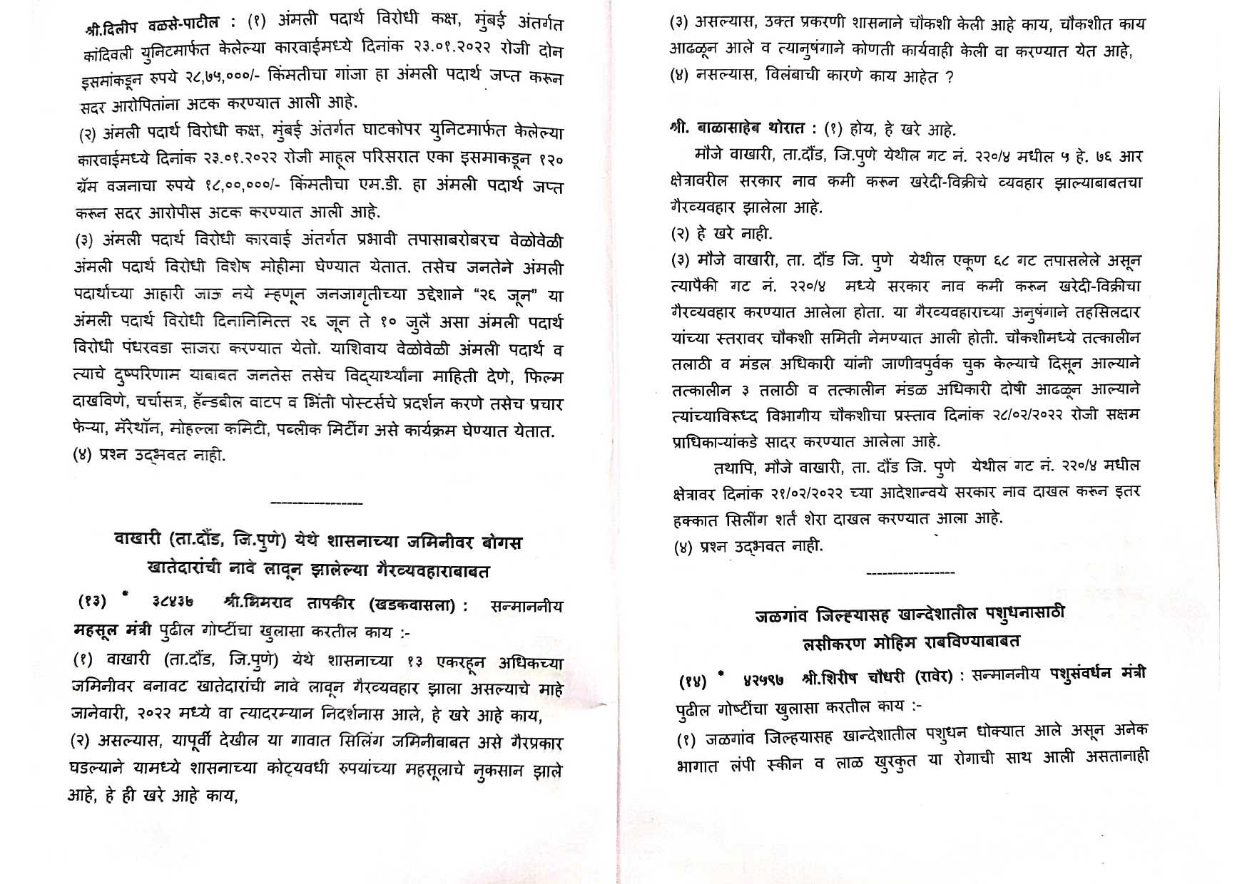 महाराष्ट्र विधानसभेच्या प्रथम अधिवेशनात काल दि. 24/03/2022 रोजी खडकवासला विधानसभा मतदारसंघाचे आमदार भिमराव तापकीर यांनी वाखरी (ता.दौंड, जि.पुणे) येथे शासनाच्या १३ एकरहून अधिकच्या जमिनीवर बनावट खातेदाराची नावे लावून गैरव्यवहार झाला असल्याबाबत तारांकित प्रश्न उपस्थित केला होता, गैरव्यवहाराबाबत शासनाने चौकशी केली आहे काय, चौकशीत काय आढळून आले व त्यानुषंगाने कोणती कार्यवाही केली वा करण्यात येत आहे, असा प्रश्न विचारला होता.
