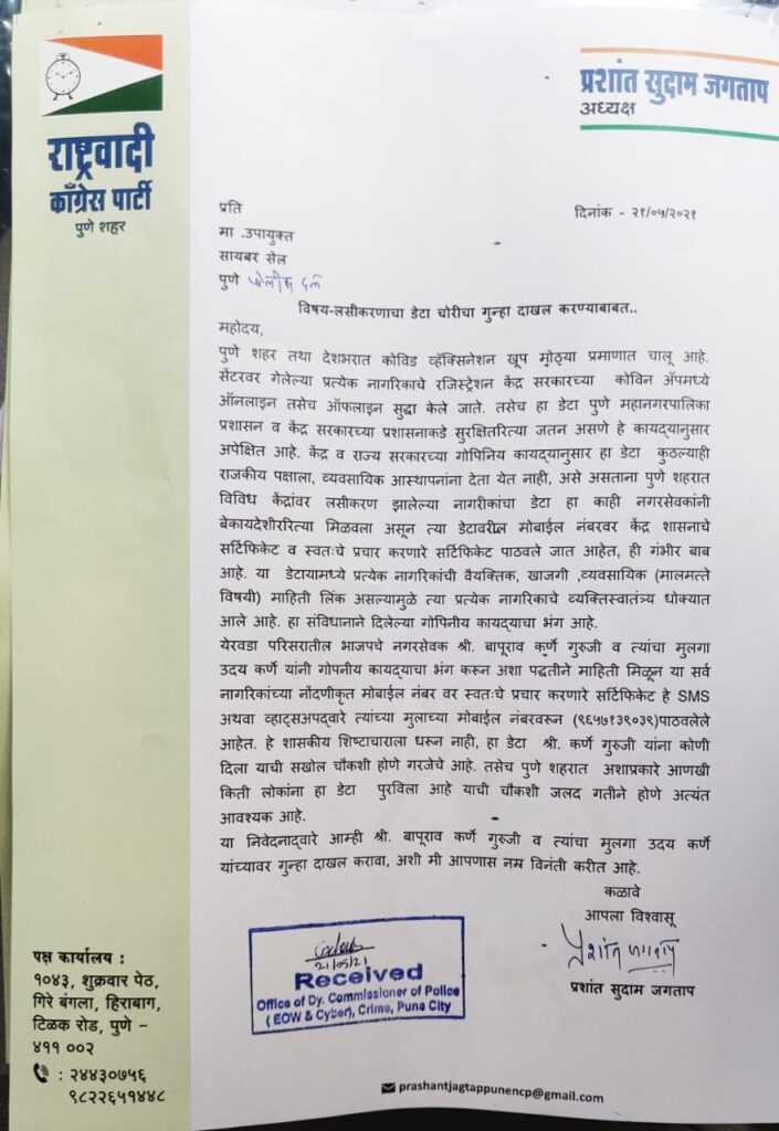 पुणे- येरवडा परिसरातील भाजपचे नगरसेवक बापूराव कर्णे गुरुजी व त्यांचा मुलगा उदय कर्णे यांनी लसीकरणाचा डेटा चोरी केल्याची तक्रार करत त्यांच्यावर गुन्हा दाखल करावा अशी मागणी एका लेखी पत्राद्वारे राष्ट्रवादीचे शहराध्यक्ष प्रशांत जगताप यांनी पुणे पोलिसांच्या सायबर सेल कडे केली आहे.