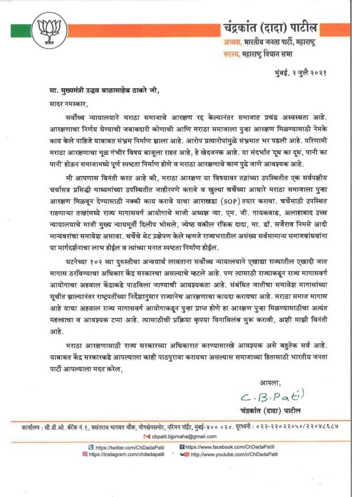पुणे-मराठा आरक्षणाच्या बाबतीत ‘दूध का दूध, पानी का पानी’ होऊन समाजामध्ये पूर्ण स्पष्टता निर्माण होण्यासाठी तज्ञांच्या उपस्थितीत जाहीर सर्वपक्षीय चर्चा आयोजित करावी आणि त्याचे थेट प्रक्षेपण करावे, अशी विनंती भारतीय जनता पार्टीचे प्रदेशाध्यक्ष आ.चंद्रकांतदादा पाटील यांनी मुख्यमंत्री उद्धव ठाकरे यांना शुक्रवारी एका पत्राद्वारे केली.