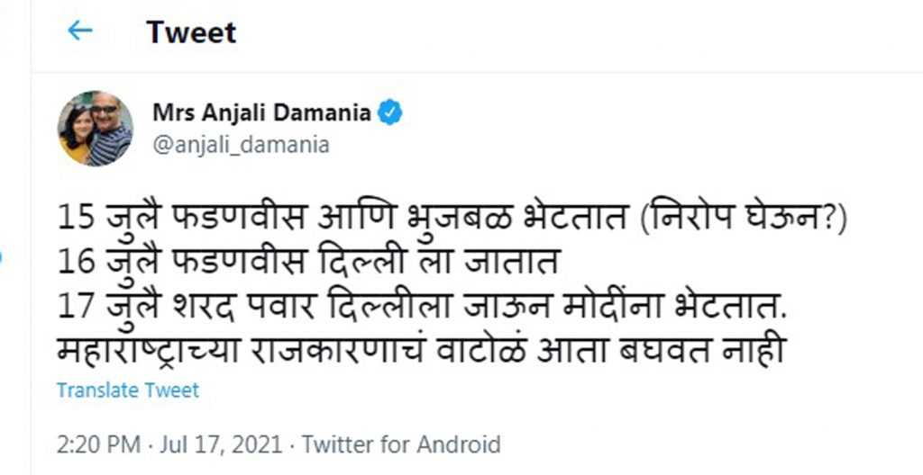 मुंबई- सामाजिक कार्यकर्त्या अंजली दमानिया यांनी पवार – मोदी भेट म्हणजे महाराष्ट्राच्या राजकारणाचं वाट्टोळंं असल्याचे संकेत दिले आहेत . त्यांनी यासंदर्भात एक ट्वीट केले आहे. १५ जुलैला फडणवीस आणि भुजबळ भेटतात (निरोप घेऊन?), १६ जुलैला फडणवीस दिल्लीला जातात, १७ जुलैला शरद पवार दिल्लीला जाऊन मोदींना भेटतात. महाराष्ट्राच्या राजकारणाचं वाटोळं आता बघवत नाही”.असं दमानिया यांनी म्हटले आहे.