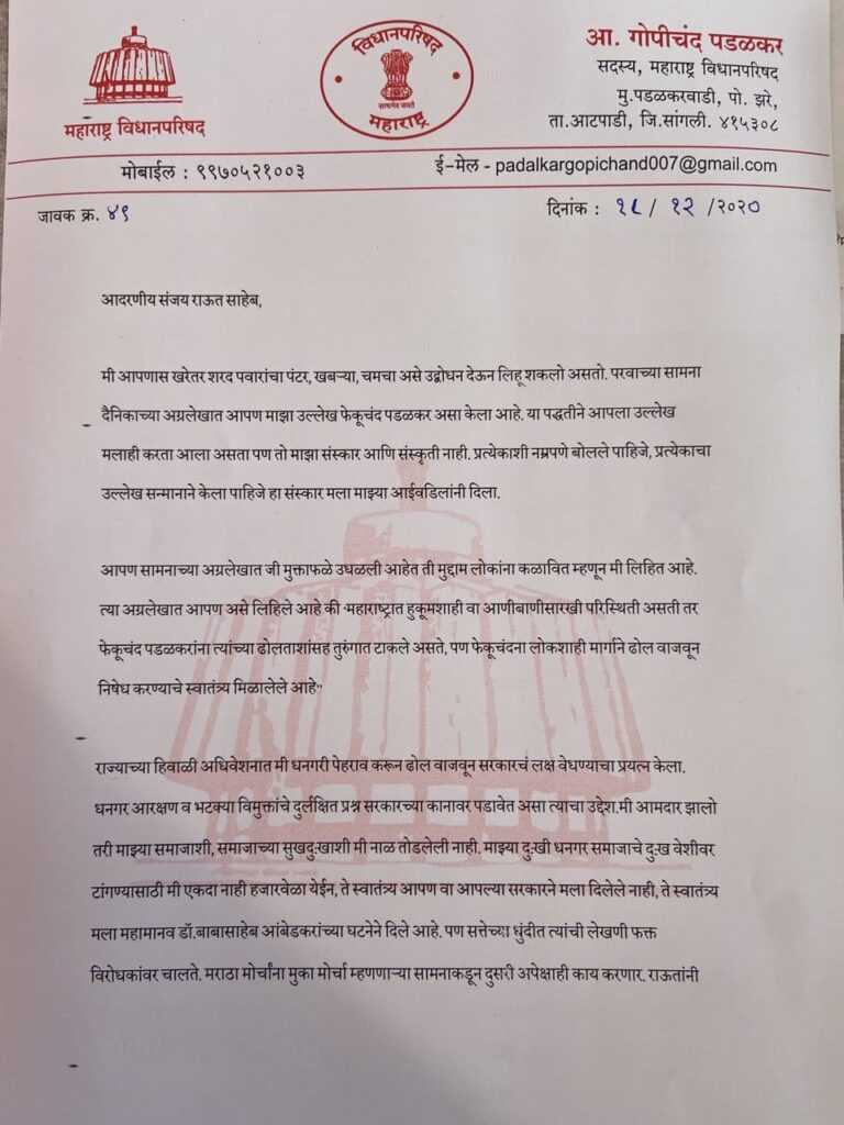 गोपीचंद पडळकर यांनी ट्विटरवर आपलं पत्र शेअर केलं आहे. “सामना मी कधी वाचत नाही. सोशल मीडियामधून मला लेख वाचायला मिळाला. सामनाच्या अग्रलेखातून संजय राऊत यांनी माझ्यावर टीका केली. त्यांच्या विकृत लिखाणाला उत्तर देण्यासाठी माझ्यासोबत अनेक जाणकार मंडळी महाराष्ट्रभर काम करत आहेत.त्याचसाठी हा पत्र प्रपंच,” असं त्यांनी पत्र ट्विट करताना म्हटलं आहे.
