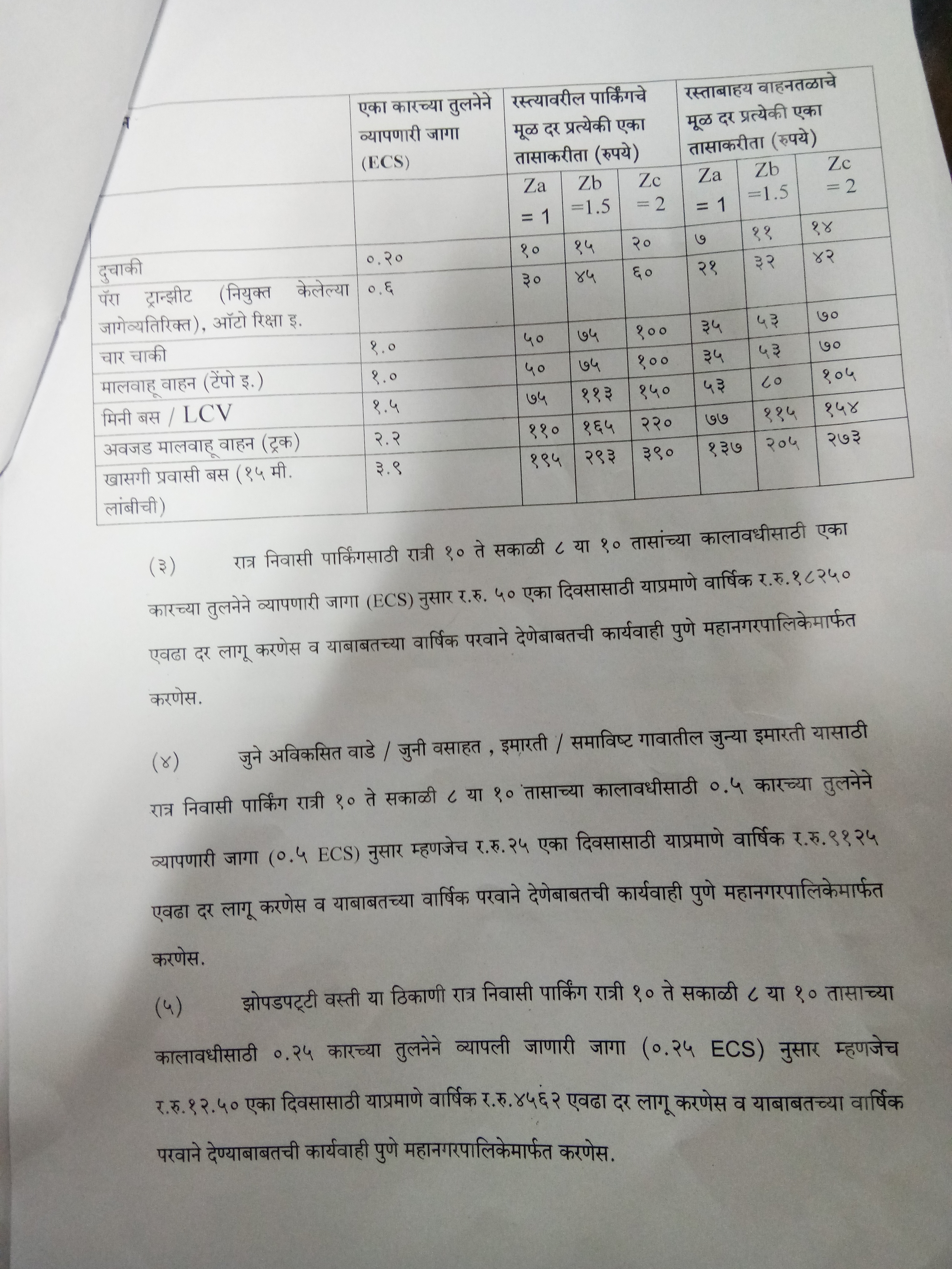 शहरातील, उपनगरातील कोणत्याही रस्त्यावर तुम्हाला गाडी पार्क करायची असल्यास दुचाकीसाठी तासाला 2ते 4 रुपये तर चारचाकी 10 ते 20 रुपये शुल्क मोजावे लागतील असा प्रस्ताव स्थायी समितीच्या बैठकीत मंजूर करण्यात आला . राष्ट्रवादी तसेच कॉंग्रेस आणि शिवसेना यांच्या 4 सदस्यांनी या प्रस्तावाच्या विरोधात मतदान केले तर भाजपच्या १० सदस्यांनी पक्षाचा आदेश म्हणून यास सहमती दिली .