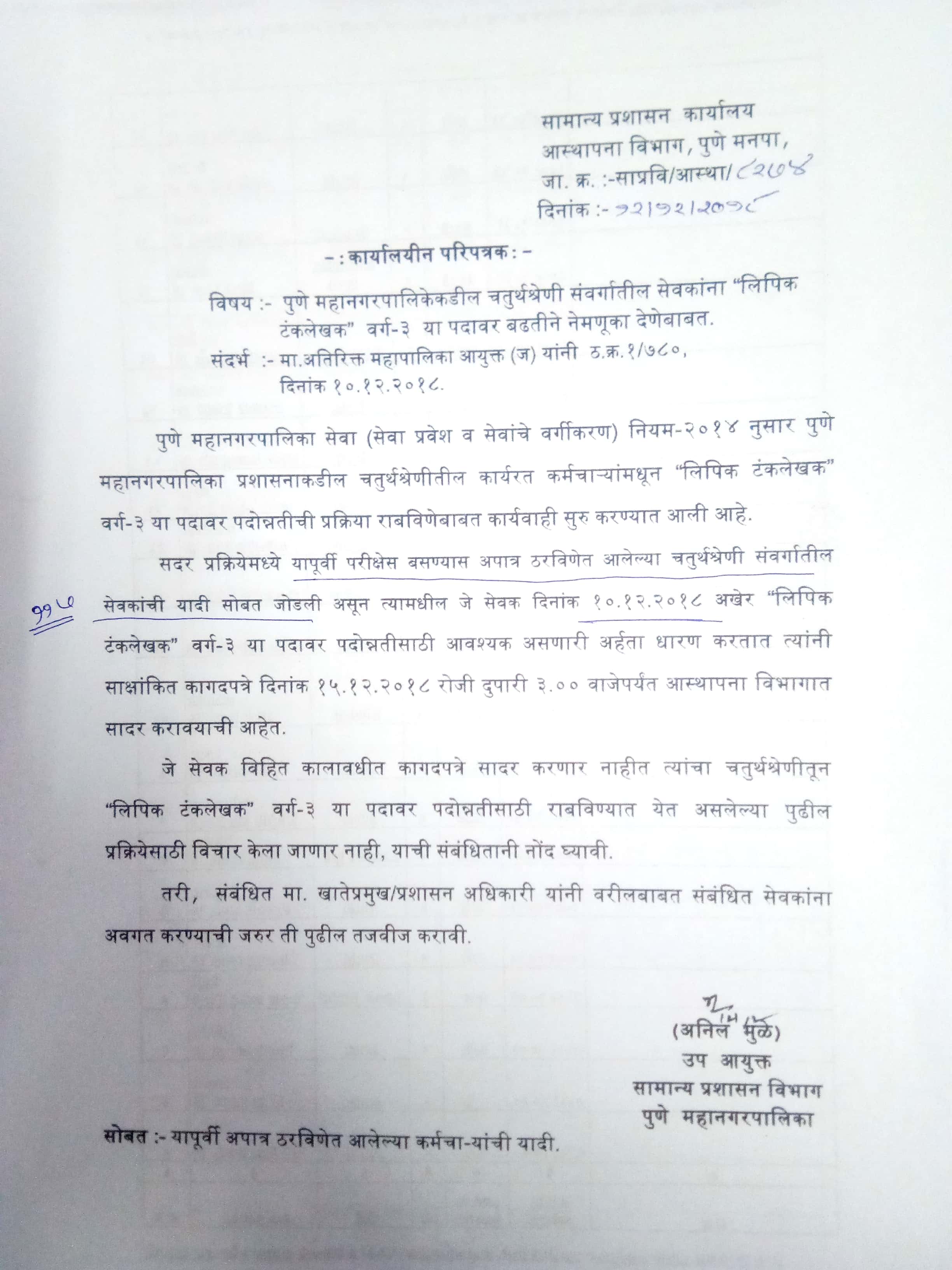 पुणे: महापालिकेच्या चतुर्थ श्रेणीच्या कर्मचाऱ्यांना लिपिक टंकलेखक ३ या पदावर पदोन्नती देण्यासाठी पात्र झालेल्या २६७ कर्मचाऱ्यांचे प्रशिक्षण झाले,परीक्षा झाल्या आणि या परीक्षांचा निकाल जाहीर करून नेमणूक करण्याच्या प्रक्रियेला प्रलंबित ठेऊन अर्जाच्या छननतच अपात्र असलेल्याना आता पदोन्नती च्या प्रक्रियेत सामावून घेण्याची मोहीम वेगाने सुरु करण्याचा अजब गजब प्रकार महापालिकेत चालू असल्याचा आरोप होतो आहे. पीएमसी एम्प्लॉईज युनियनने या प्रकरणी घोटाळे होत असल्याचा संशय व्यक्त केला आहे.चतुर्थश्रेणी कर्मचाऱ्यांमधून तृतीय श्रेणीत घेण्यासाठी म्हणून घेतलेल्या परीक्षेचा निकाल जाहीर न करता थेट यादीच जाहीर करून त्यात अपात्र उमेदवारांची नावे घुसडण्याचा प्रकार झाला असल्याचे युनियनचे म्हणणे आहे.