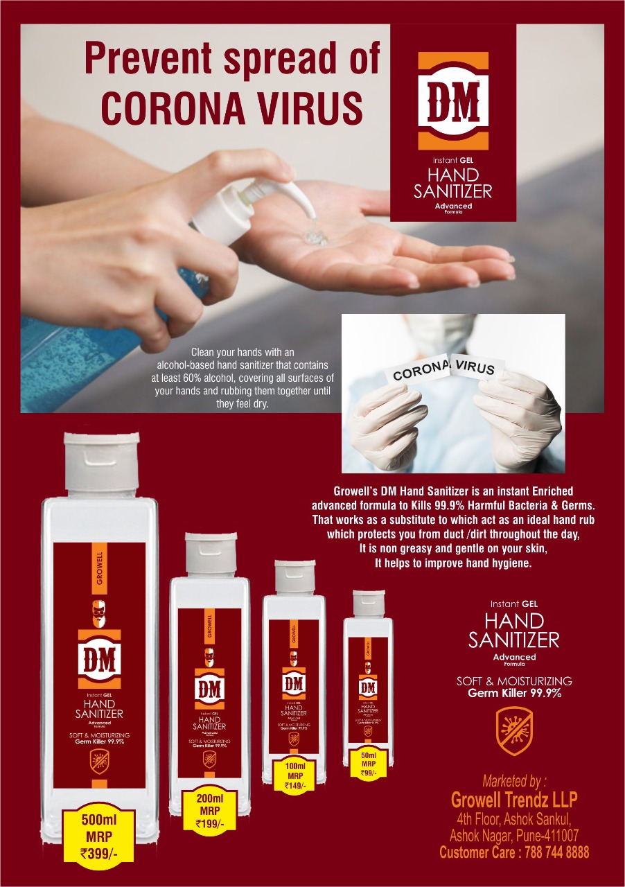 ‘कोरोना व्हायरस साथीच्या पार्श्वभूमीवर नागरिकांनी काळजी करू नये ,पुण्यात सॅनिटायझर ,मास्क पुरेशा संख्येत उपलब्ध आहेत ‘, अशी माहिती ‘डीएम स्टॉप ‘ या सॅनिटायझरचे उत्पादक ,वितरक, ‘ग्रोवेल ट्रेंड्झ ‘ या सॅनिटायझर उत्पादक कंपनीचे संचालक तरुण अहुजा ,’मेडिक्युअर ‘ चे संचालक कन्हय्या चौधरी, तरुण इंटरप्रायझेस चे संचालक मनोहरलाल अहुजा यांनी पत्रकाद्वारे दिली .