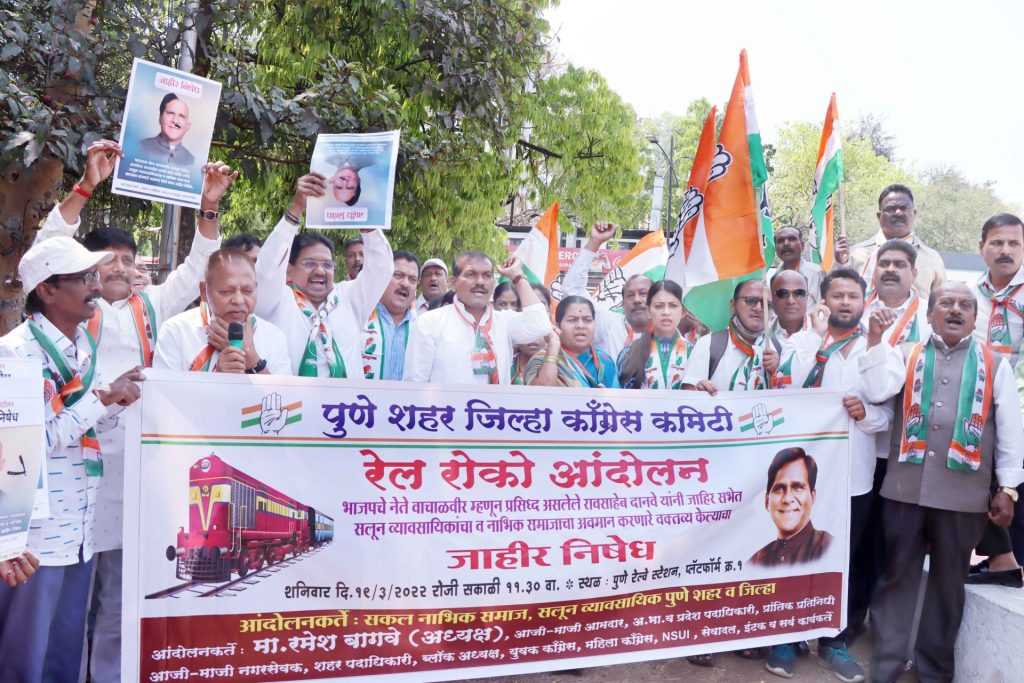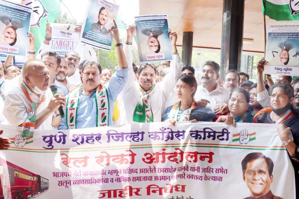 यावेळी शहराध्यक्ष रमेश बागवे म्हणाले की, ‘‘आम्ही महात्मा गांधींना आदर्श मानतो. त्यामुळे आमची प्रत्येक आंदोलन ही अहिंसक असतात आणि ती कायमच अहिंसक राहतील. परंतु रेल्वे पोलिसांना पुढें करून केंद्रीय राज्यमंत्री रावसाहेब दानवे जरी आमचे आंदोलन दडपून टाकू पाहत असले तरीही आमचा आवाज मात्र ते दाबू शकत नाहीत. रावसाहेब दानवे यांच्या डोक्यात सत्तेची आणि मंत्रिपदाची हवा गेली आहे त्यामुळे ते कधी शेतकऱ्यांचा अपमान करतात तर कधी बहुजन समाजातील बारा बलुतेदारांचा अपमान करतात. शिवा काशीद यांनी छत्रपती शिवाजी महाराजांचे प्राण वाचवण्यासाठी आपल्या जीवाची बाजी लावली होती. ‘‘होता जिवा म्हणून वाचला शिवा’’ अशी म्हण ज्या समाजातील मावळ्याने केलेल्या कार्यामुळे रूढ झाली. अशा समाजाबाबत त्यांच्या कामावरुन आक्षेपार्ह विधान करणे ही मनुवादी वृत्ती आहे. हे संघाचे संस्कार रावसाहेब दानवे आणि भाजपच्या प्रत्येकच नेत्यात नेहमी दिसतात. मग ते कधी शिवरायांचा अवमान करतील तर कधी महात्मा ज्योतिराव फुले, सावित्रीबाई फुले यांचा अवमान करतील. कधी शेतकऱ्यांना अपमानास्पद वागणूक देतील तर कधी नाभिक समाजाबाबत आक्षेपार्ह विधान करतील. या सर्व वृत्तीचा पुणे शहर काँग्रेस कमिटीच्या वतीने आम्ही निषेध करतो.’’