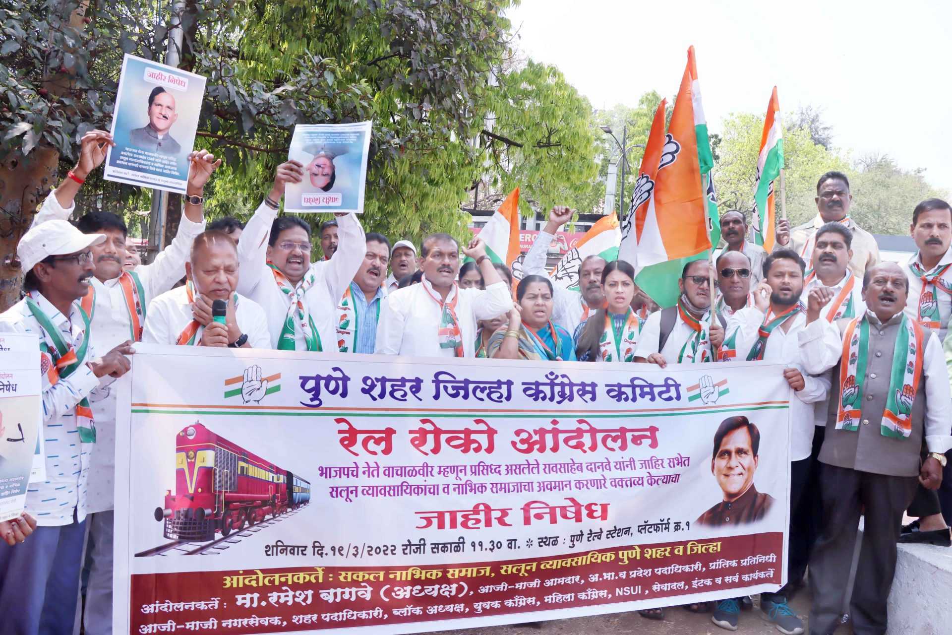 नाभिक समाजाचा अपमान करणाऱ्या केंद्रिय रेल्वे राज्यमंत्री रावसाहेब दानवे यांच्या विरोधात पुणे शहर जिल्हा काँग्रेस कमिटीची निदर्शने.