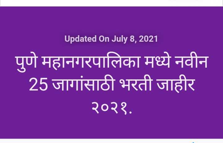 पुणे महानगरपालिकेकडून लवकरच चौथी पास असलेल्या उमेदवारांची भरती केली जाणार आहे. यासाठीची अधिसूचना जारी करण्यात आली आहे. सफाई सेवक (Sweeper) या पदासाठी ही भरती केली जाणार आहे. यासाठी पात्र उमेदवार ऑनलाइन अर्ज करु शकतात. ही भरती 25 रिक्त पदांसाठी होणार आहे. अर्ज करण्याची शेवटची तारीख 12 जुलै 2021 आहे