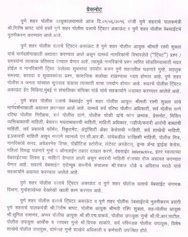 पुणे पोलीस वेबसाईटचा चेहरा मोहरा बदलला आहे. यामध्ये अनेक बदल करण्यात आले आहे. त्यात सर्व वरिष्ठ पोलीस अधिकारी, सर्व पोलीस ठाणे, वरिष्ठ पोलीस निरीक्षक, पोलीस चौकी, यांचे फोन क्रमांक प्रेसनोट, मिसिंग व्यक्तींबाबतची माहिती, बेवारस मयताबाबतची माहिती, माहिती अधिकार, पाहिजे, फरारी आरोपी, सर्व प्रकारचे फॉर्मस, रिक्रुटमेंट, अॅट्रॉसिटी अॅक्ट केसेसची माहिती, सर्व शाखेची माहिती आहे.
