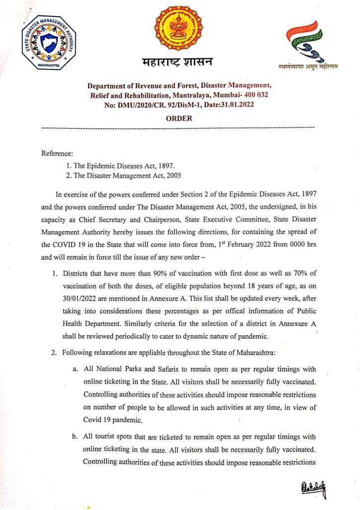 पर्यटनस्थळे, नॅशनल पार्क : सर्व पर्यटनस्थळे, नॅशनल पार्क, सफारी नियमित वेळेनुसार खुल्या राहतील. तिकीट ऑनलाइन खरेदी करावे लागेल. दोन्ही डोस आवश्यक.