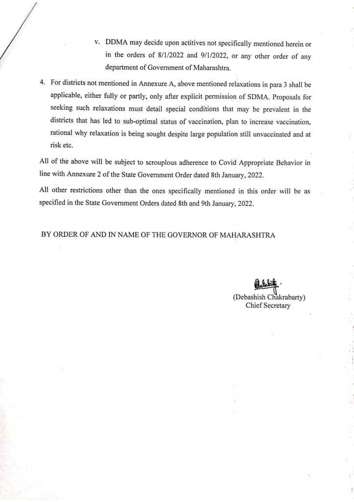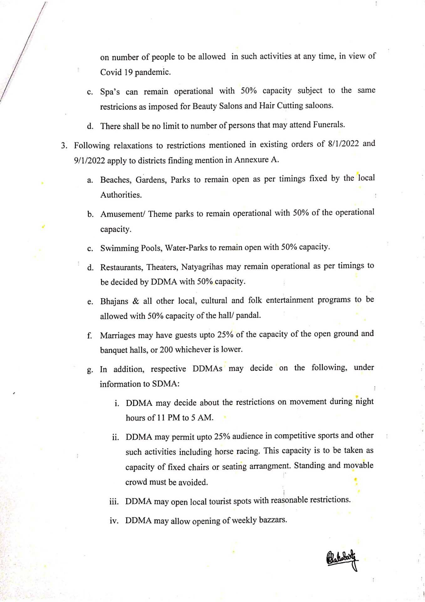 धार्मिक सोहळे उदा.भजन-कीर्तन, करमणूक, कला- सांस्कृतिक कार्यक्रमांना हॉल, मांडवाच्या ५० टक्के क्षमतेने परवानगी. जलतरण तलाव, वॉटर पार्क, अॅम्युझमेंट व थीम पार्क रेस्टॉरंट, चित्रपट, नाट्यगृहे, ‘स्पा’ ५० टक्के क्षमतेने सुरू.