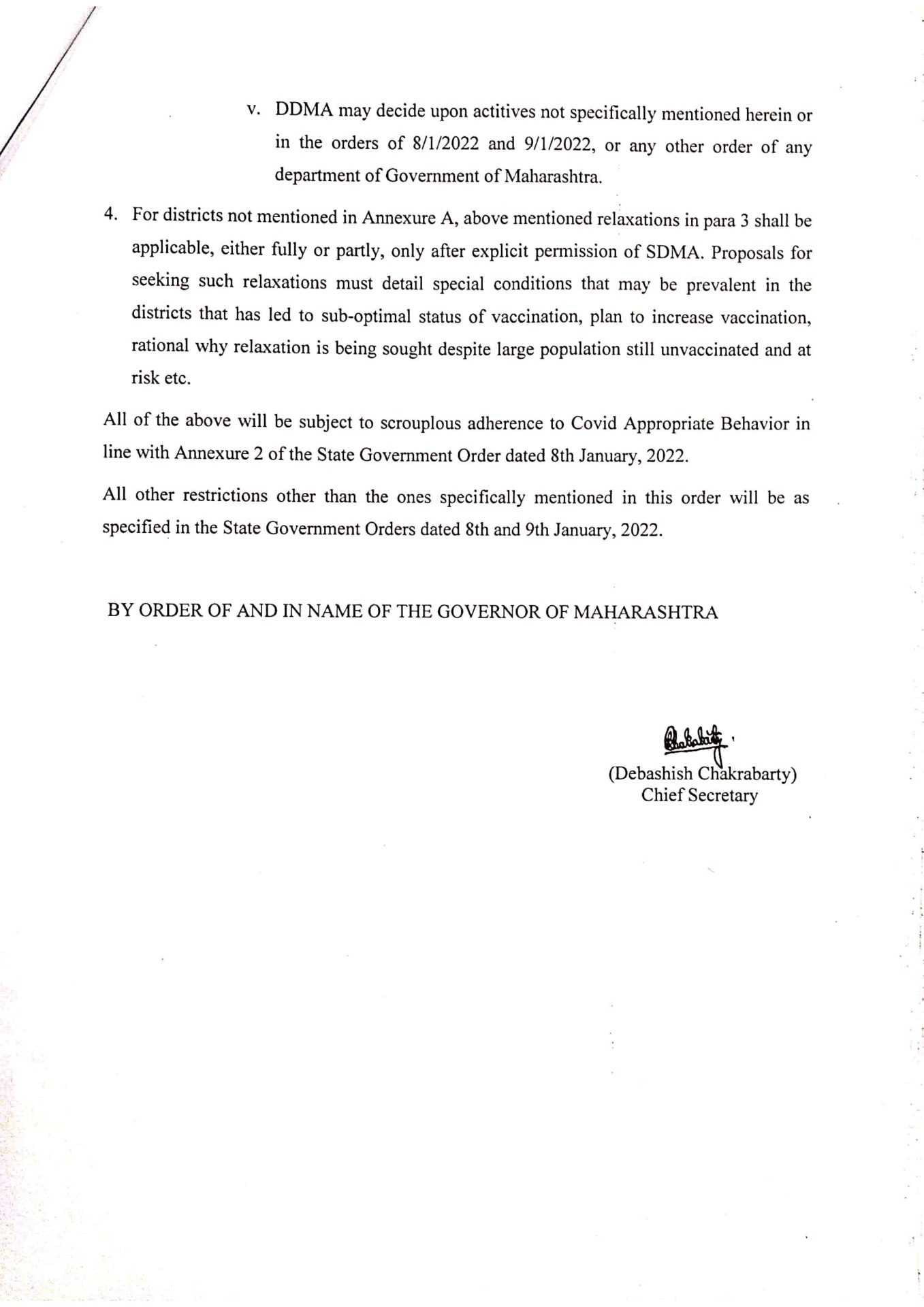 मुंबई- कोरोना रुग्णसंख्या झपाट्याने कमी होत असल्याने राज्यातील निर्बंध सोमवार मध्यरात्रीपासूनच शिथिल करण्यात आले आहेत. सुधारित नियमावलीनुसार पर्यटनस्थळे, उद्याने, पार्क उघडण्यास परवानगी देण्यात आली असून धार्मिक सोहळे, कला-सांस्कृतिक कार्यक्रमांना ५० टक्के क्षमतेने तर विवाह सोहळ्यास कमाल २०० जणांना उपस्थित राहण्यास मुभा असेल. तसेच अंत्यविधीसाठी उपस्थितीची मर्यादा हटवण्यात आली आहे. आठवडे बाजारासही मुभा देण्यात आली आहे.सोमवारी रात्री उशिरा मुख्य सचिव देवाशिष चक्रवर्ती यांनी नवी नियमावली जारी केली. त्यानुसार ज्या जिल्ह्यांमध्ये लसीचा पहिला डोसचे प्रमाण ९०% आणि दोन्ही डोसचे प्रमाण ७०% असेल त्या जिल्ह्यांसाठी ही नियमावली लागू असेल. रात्री ११ ते सकाळी ५ वाजेपर्यंतची संचारबंदीबाबतचा निर्णय संबंधित जिल्ह्यांमधील आपत्ती व्यवस्थापन प्राधिकरणावर सोडण्यात आला आहे.