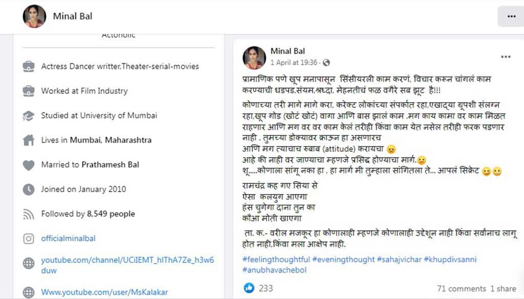 मराठी सिनेसृष्टीतील अभिनेत्री मीनल बाळ हे तिचे नाव . तिने आतापर्यंत अनेक मालिकांमध्ये काम केले आहे. तसेच भेटली तू पुन्हा, इरादा पक्का यासारख्या चित्रपटातही ती झळकली. तसेच स्वराज्य रक्षक संभाजी या मालिकेतही तिने ‘लाडी’ ही भूमिका साकारली होती. नुकतंच मीनलने फेसबुकवर एक पोस्ट शेअर केली आहेतिची ही पोस्ट सध्या चांगलीच चर्चेत आहे.
