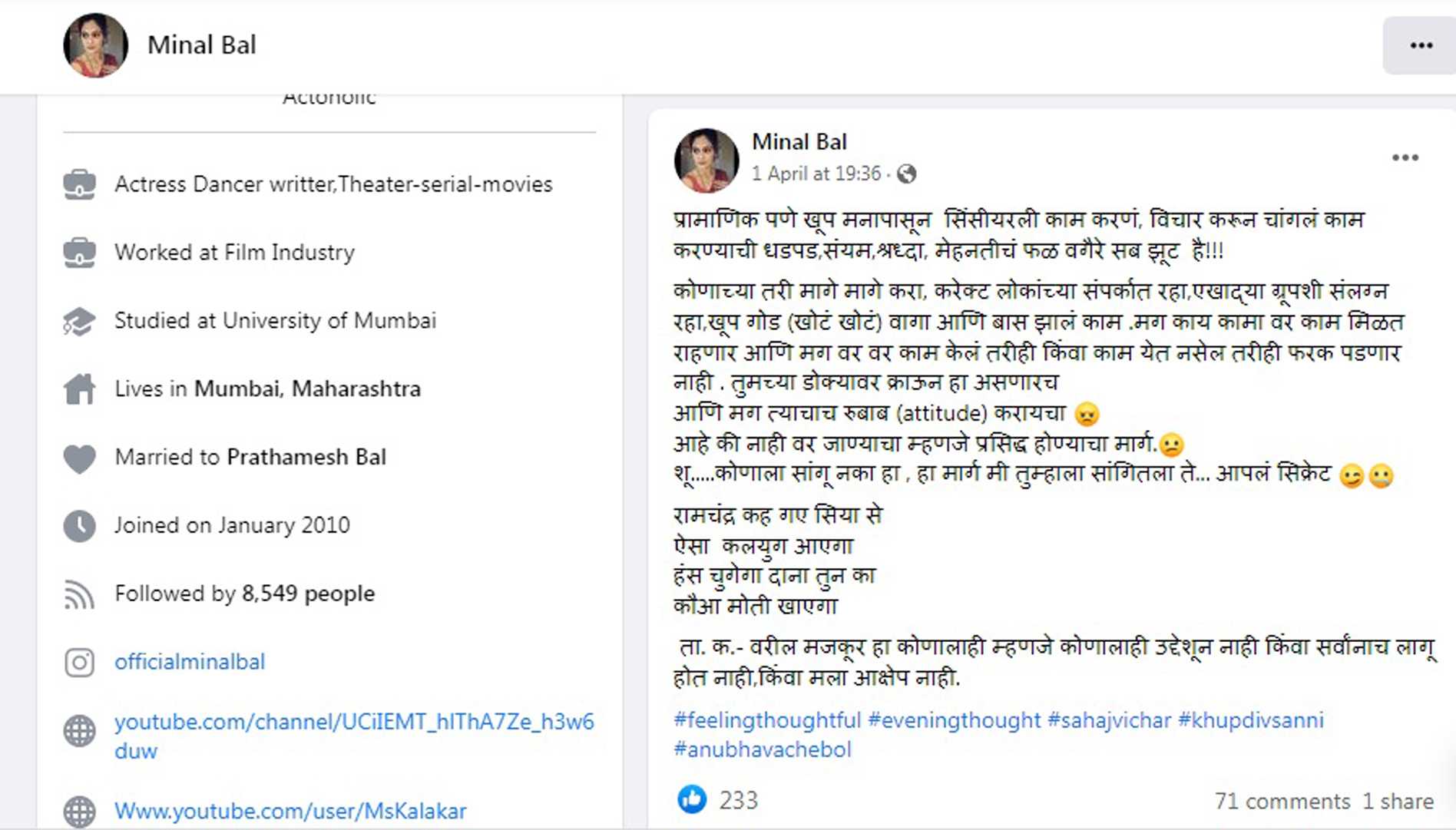 रामचंद्र कह गए सिया से, ऐसा कलयुग आएगा, हंस चुगेगा दाना तुन का, कौआ मोती खाएगा. ता. क.- वरील मजकूर हा कोणालाही म्हणजे कोणालाही उद्देशून नाही किंवा सर्वांनाच लागू होत नाही किंवा मला आक्षेप नाही, अशी पोस्ट मीनलने शेअर केली आहे.