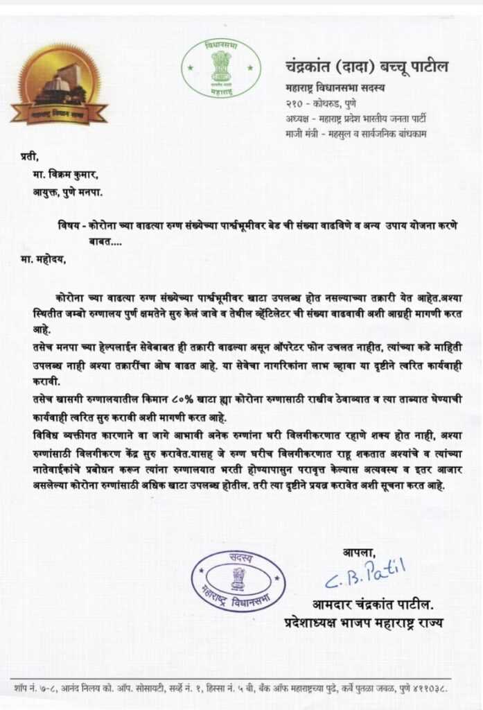 पुणे- जंबो तातडीने पूर्ण क्षमतेने सुरु करा , विलगीकरण कक्ष ,कोविड केअर सेन्टर्स तातडीने सुरु करा , खाजगी हॉस्पिटल मधील ८० टक्के खाटा ताब्यात घ्या अशा विविध सूचना करत महापालिकेने आता तरी युध्द पातळीवर कोविद चा सामना करण्यास पूर्ण क्षमतेने उतरले पाहिजे अशा स्वरूपाच्या सूचना कोथरूड चे आमदार आणि भाजपचे प्रदेशाध्यक्ष आ. चंद्रकांतदादा पाटील यांनी महापलिका आयुक्तांना केल्या आहेत.