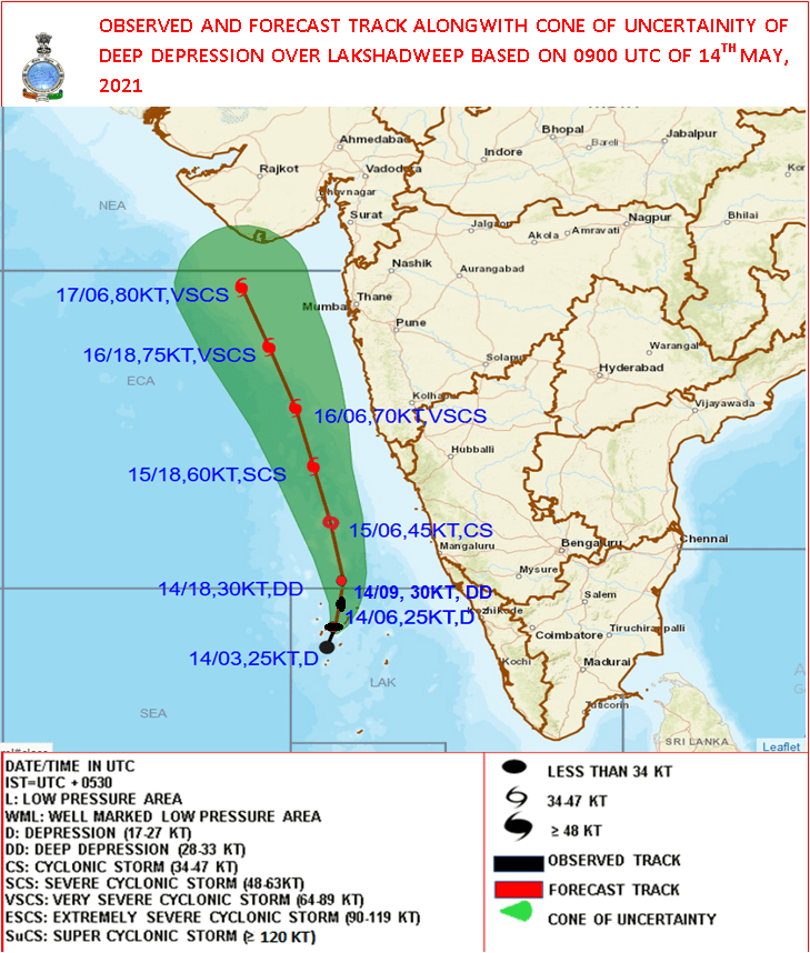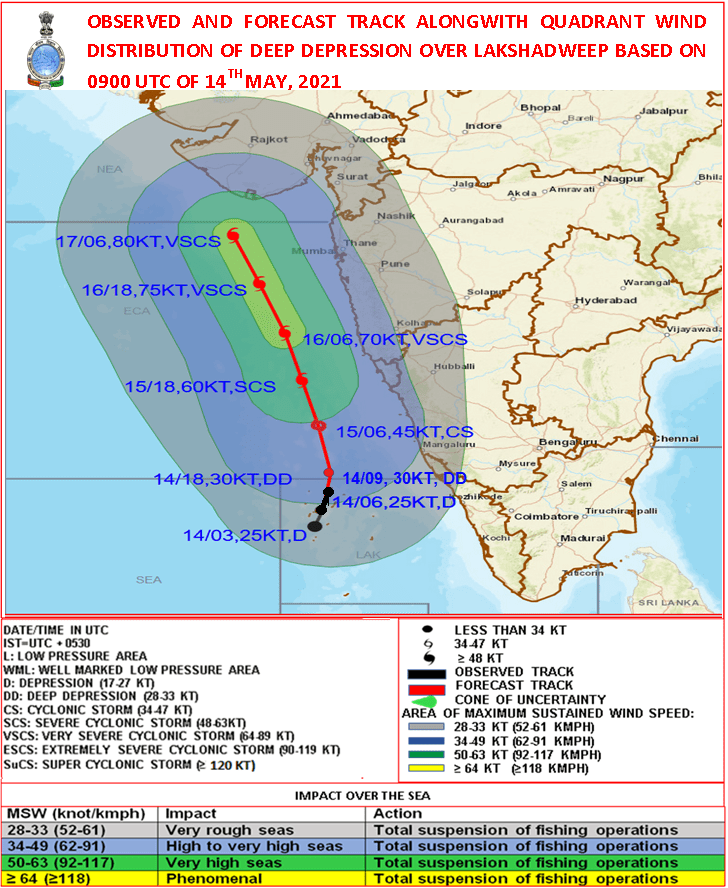 भारतीय हवामन विभागणे असे स्पष्ट केले आहे कि,’चक्रीवादळ तौंते हे शनिवार सकाळपर्यंत त्याच भागात असेल. त्यानंतर रविवारी (१६ मे) चक्रीवादळामध्ये तीव्रता येईल. यामुळे देशाच्या दक्षिणेकडील भागात मुसळधार पाऊस पडण्याची शक्यता आहे. चक्रीवादळात वेगाने होणारी वाढ लक्षात घेता भारतीय हवामान खात्याने (आयएमडी) महाराष्ट्र व गुजरातच्या काही भागात मुसळधार पावसाचा इशारा दिला आहे.