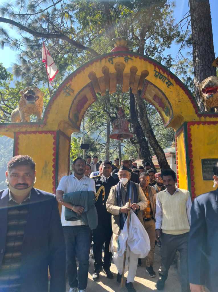 मुंबई : उत्तराखंड राज्यातील आपले जन्मगाव असलेल्या नामती चेताबगढ येथे दौऱ्यावर आलेल्या राज्यपाल भगत सिंह कोश्यारी यांनी आज जवळच असलेल्या प्रसिद्ध माँ भगवती मंदिरात जाऊन देवीचे दर्शन घेतले.चेताबगढ हे गाव बागेश्वर जिल्ह्यातील कपकोट तहसीलमध्ये आहे. पहाडी भागातून अतिशय दुर्गम वाटचाल करून या मंदिरात येताना राज्यपालांचे स्थानिक नागरिकांनी स्वागत केले.