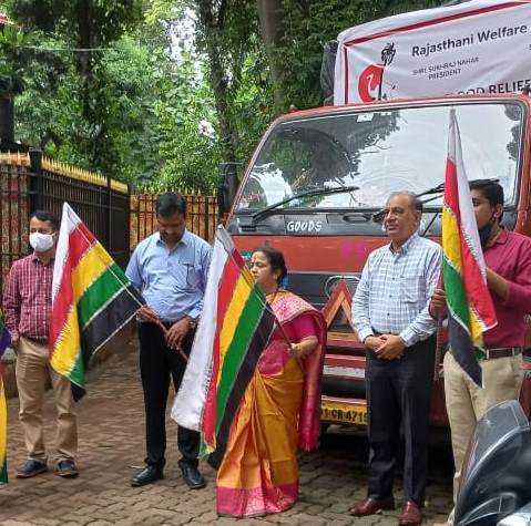 मुंबई- महापौर श्रीमती किशोरी किशोर पेडणेकरयांनी यांच्या हस्ते गुरुवारी कोकणातील नुकसानग्रस्त लोकांच्या मदतीसाठी 8 हजार किलो रेशन साहित्याचे ट्रक रवाना करण्यात आले. महापौर बंगल्यावर राजस्थानी वेलफेअर असोसिएशनाच्या वतीने मदत साहित्य पाठविण्यात आलेल्या या प्रसंगी बोलतांना राजस्थानी वेल्फेअर असोसिएशनचे प्रमुख सुखराज नाहर म्हणाले की, संकटकाळात आपल्या बांधवांना मदत करणे हे सर्वांचे कर्तव्य आहे. असोसिएशनाच्या या मदत साहित्यामध्ये जीवनावश्यक वस्तुंचे समावेश आहे. महापौर श्रीमती किशोरी पेडणेकरयांनी या सहकार्यासाठी संस्थेचे कौतुक केले.
