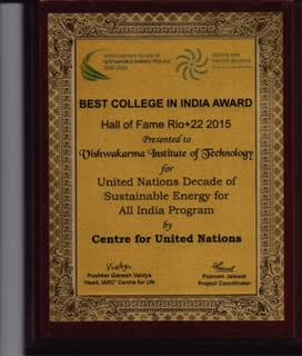 ‘विश्वकर्मा इन्स्टिट्यूट ऑफ टेक्नॉलॉजी’ला (व्हीआयटी) ‘युनायटेड नेशन्स सेंटर, आयएआरसी, मुंबई’तर्फे नुकताच ‘बेस्ट कॉलेज इन इंडिया’ पुरस्कार देऊन गौरवण्यात आले. ‘रिओ+२२ युनायटेड नेशन्स डिकेड ऑफ सस्टेनेबल एनर्जी फॉर ऑल इंडिया प्रोग्रॅम’ या कार्यक्रमात या संस्थेच्या विद्यार्थ्यांनी केलेल्या उत्कृष्ट कामगिरीचा सन्मान म्हणून हा पुरस्कार देण्यात आला. हा कार्यक्रम ‘युनायटेड नेशन्स कॉन्फरन्स ऑन सस्टेनेबल डेव्हलपमेंट’ने (यूएनसीएसडी) प्रायोजित केला होता. ‘आयएआरसी सेंटर, मुंबई’ने संस्थेला सुवर्णचिन्ह व मानपत्र देऊन गौरवले.