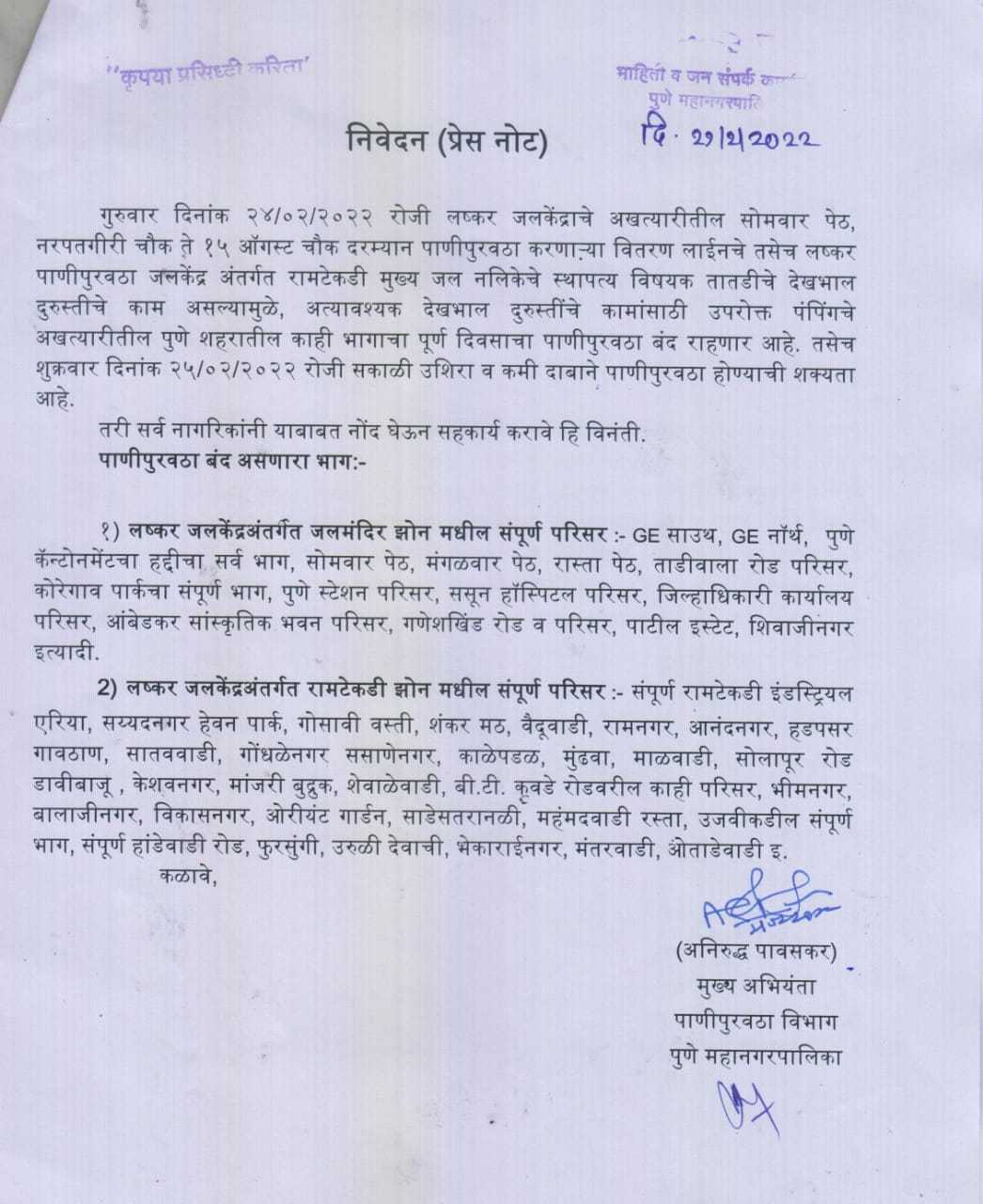 तसेच शुक्रवारी (दि. २५ फेब्रुवारी) सकाळी उशिरा व कमी दाबाने पाणीपुरवठा होण्याची शक्यता आहे.