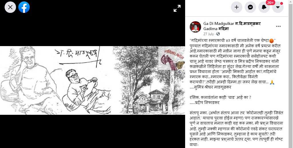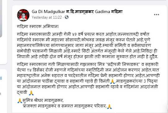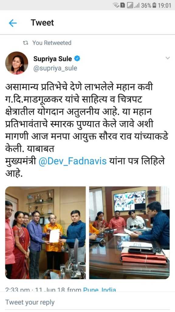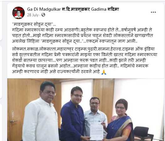 पुणे- आज पुण्याच्या महापौरांनी गदिमा स्मारकाची घोषणा केली खरी .पण या मागे त्यांचं मोठं राजकारण दडलं असल्याचा आरोप सांस्कृतिक क्षेत्रातून होतो आहे. या क्षेत्रातून असंही सांगितलं जातंय कि ,गदिमा स्मारक, जागा, आराखडा सगळं जुनं आहे त्यात नवीन काही नाही.सुमित्र माडगूळकर यांनीच स्मारकाचा आराखडा दिला होता.पण महापालिकेला त्याचा सोयीस्कर विसर पडला. आताचे महापौर पद हि औट घटकेला आलेय . बातमी ही आहे की 14 डिसेंम्बर ला गदिमा स्मारक न झाल्याच्या निषेधार्थ जे राज्यभर आंदोलन होणार होते . ते होऊ नये अन्यथा निव्वळ घोषणाबाजी बाबत सर्व खापर आपल्यावर फोडले जाईल म्हणून त्यापूर्वीच ही जाहीर घोषणा करण्यात आली आहे. असा आरोप या क्षेत्रातून होतो आहे. विद्यमान महापौरांचे मराठी सिनेसृष्टीतील दिग्गजांशी कायमचे संबध असून या स्मारकाचा आणि आणि बालगंधर्व रंगमंदिरात गडकरी यांचा पुतळा बसविण्याबाबत का दिरंगाई झाली हे गूढ अनेक कलाकारांना उकललेले नाही .